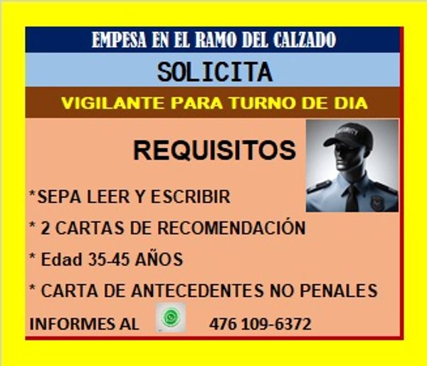 VIGILANTE Empresa de calzado busca vigilante edad de 35 a 45 años con cartas de recomendacion, interesados enviar wattsap 4761096372.